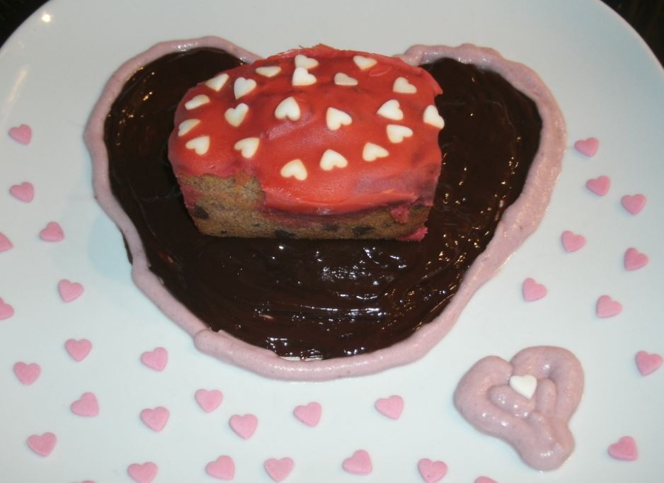 Angerichtet wurde der kleine Kuchen zum Valentinstag auf einem Schokospiegel mit selbstgemachter Rotweinmousse.