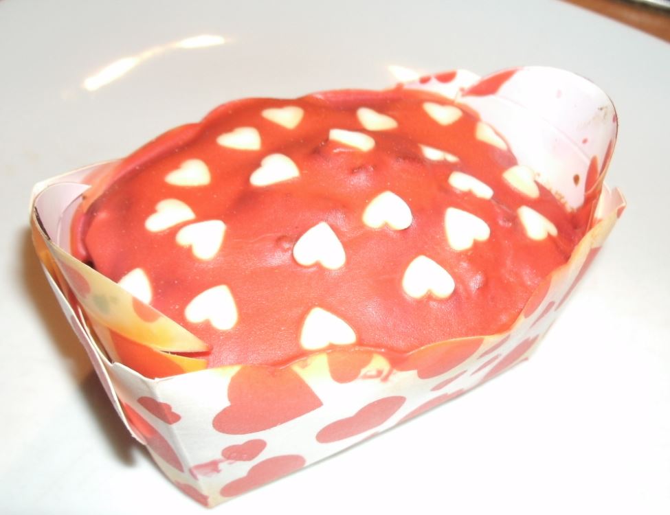 Nach dem Erkalten rote Candy Melts mit etwas Kokosfett erwärmen und auf das Törtchen streichen; nach Wunsch mit Herzen versehen. Alternativ geht auch eine normale Zuckerglasur, die man statt Zitrone mit Rotwein/Kirschsaft zubereiten kann.